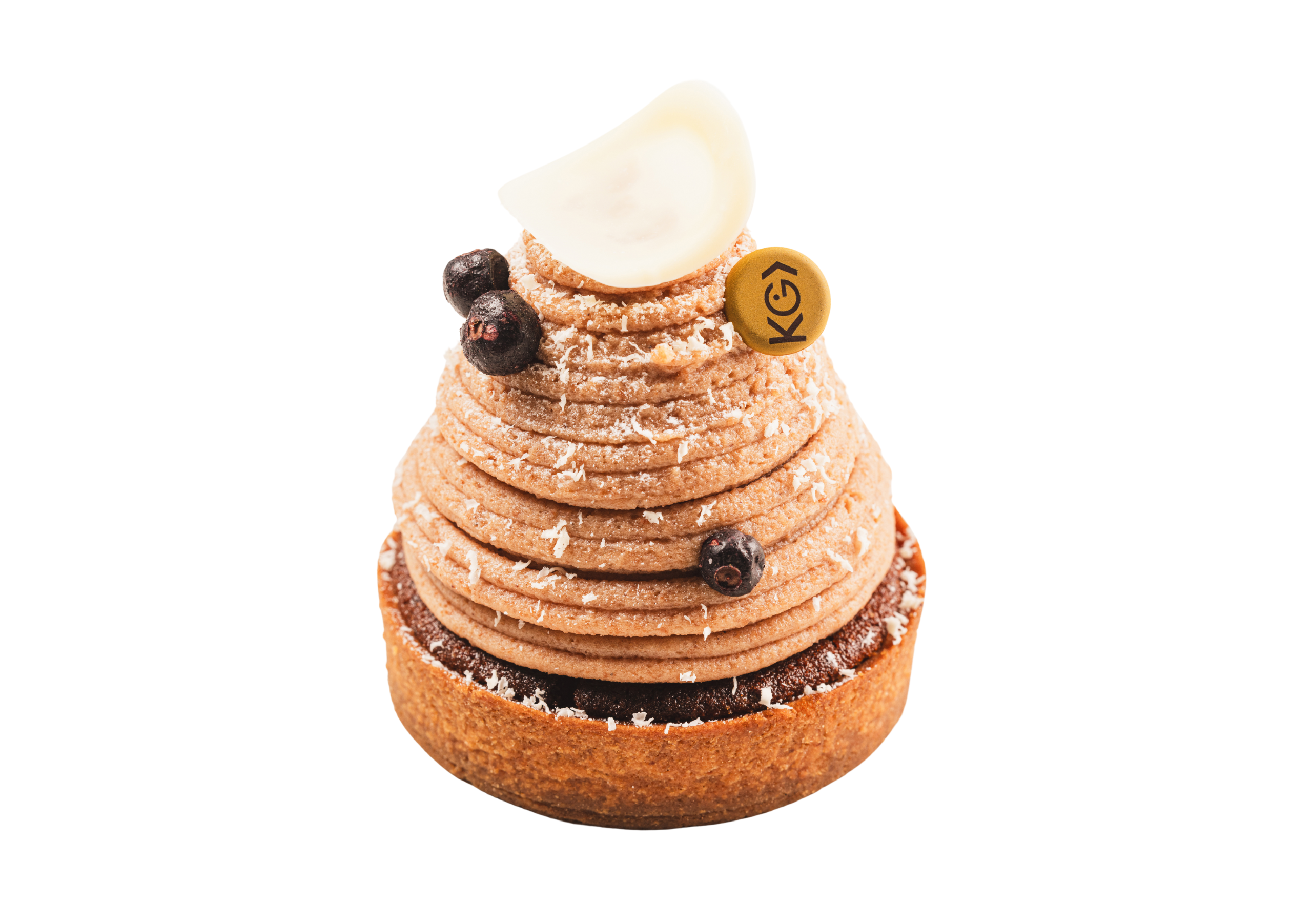 Composition : tarte frangipane-rhum, bavaroise aux marrons, compotée de cassis et confit de marrons.